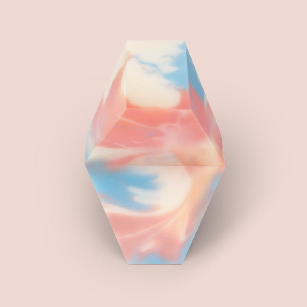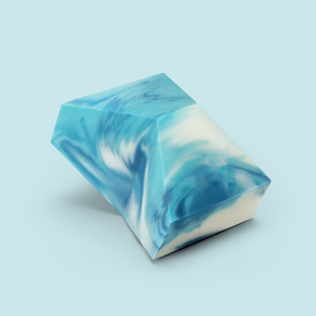 同樣採用如蝴蝶結般具有功能性的多角面設計,讓濕手使用時可以牢握在掌心不滑脫,大幅降低因肥皂濕滑墜地而沾黏毛髮、髒汙的機率;大塊面可以和頭髮/掌心/海綿/沐浴巾快速搓揉出細緻的泡沫,邊角也可以針對身體痠痛的部位按摩紓緩疼痛。