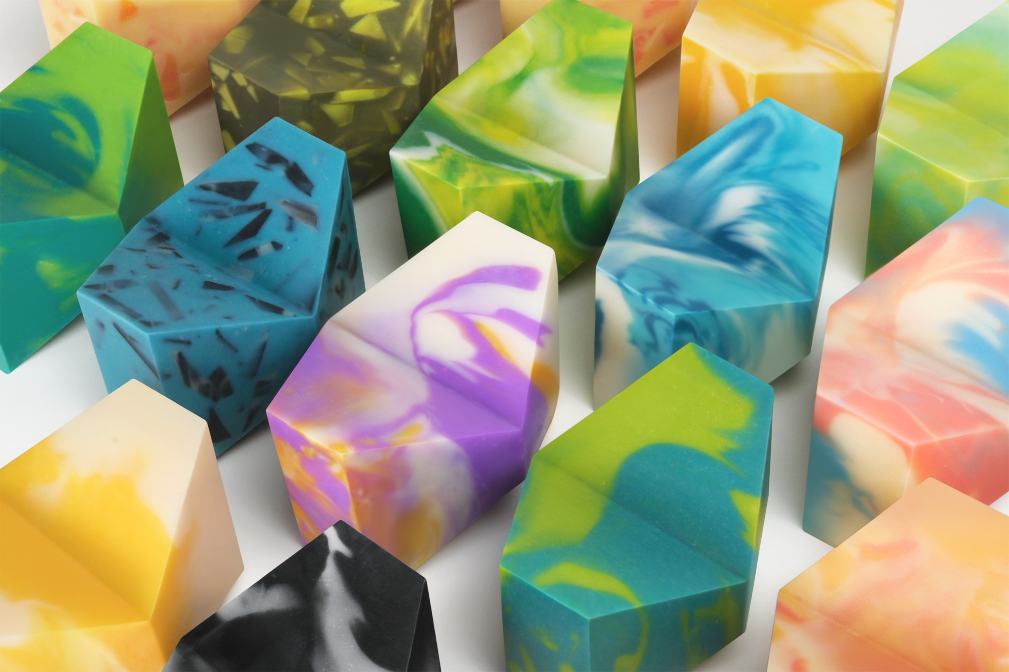 一般坊間的手工皂多是以矽膠模具澆灌製成,雖然矽膠沒有毒性,但棄置後也需要100年以上才能自然分解;我們使用可以完全回收利用的塑料板摺製出澆灌皂體的模具,不但可以做出具有銳利稜線的皂體,模具也可以無限次重複使用,在製程中也恪守著對環境友善的原則。