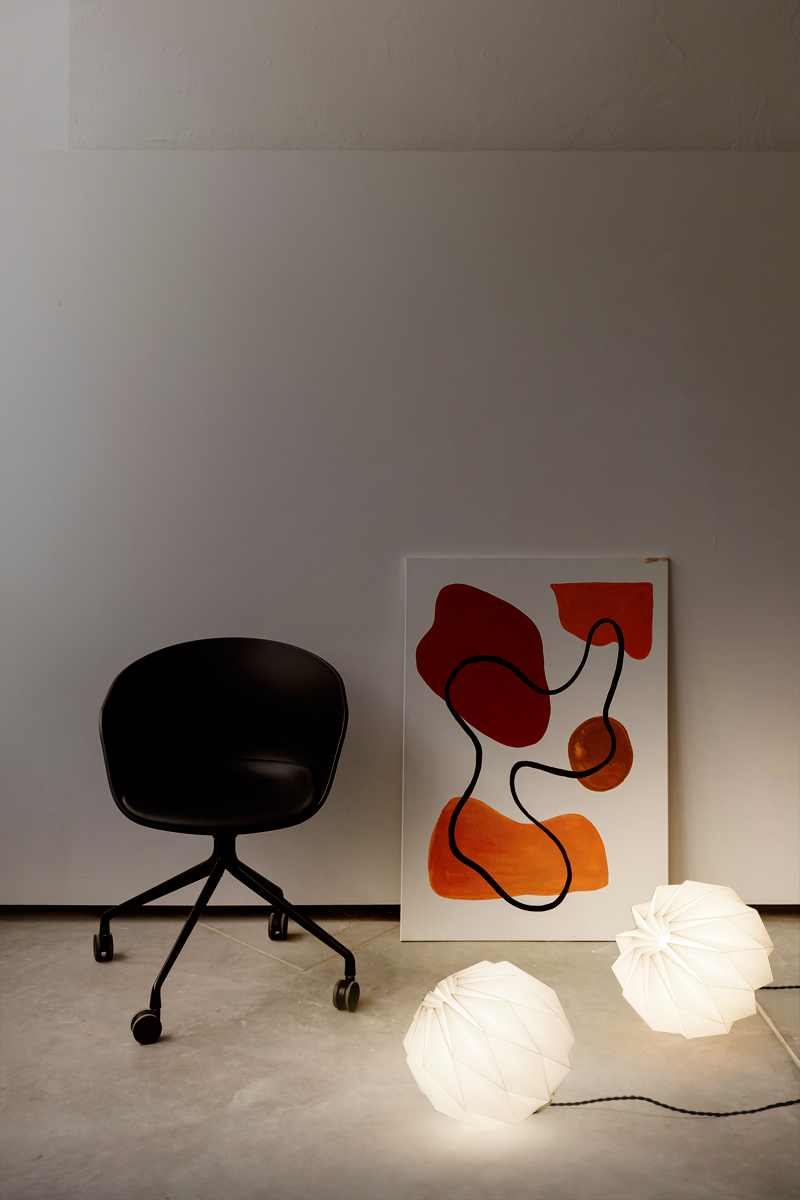 “STELLAR” is a perfect combination of modern origami technique and fine craftsmanship, designed to lit your home space with poetic aesthetic and elegance. The lamp shade is made from one singular PP sheet with score lines and manually hand folded into an origami sphere. The lamp shade was closed by hand stiches in order to achieve 360 degree omni glow effect without dark shades of overlapping glue marks. This also allows you to place the lamp freely without limited viewing angles.