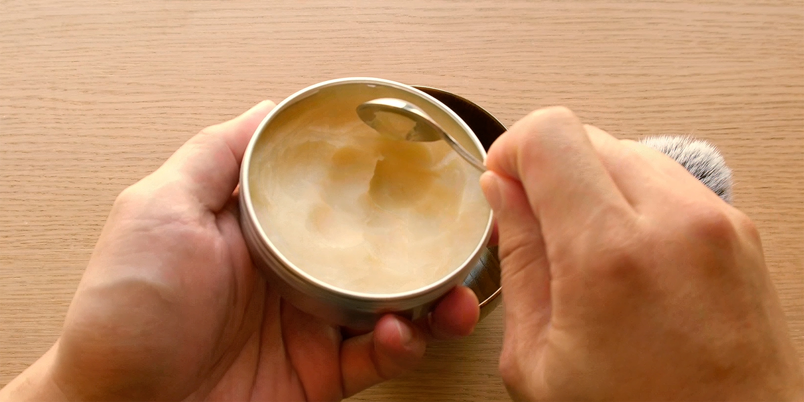 所以如果您是用小湯匙取皂的話,挖取的手勢可以稍微使力往下一點挖;用刷取皂也可以用手指掐著刷毛在轉圈摩擦時加點壓力,總之不要只刮取表面氣味較淡的皂,這樣您便可以取得香氣較為充沛的皂,打成泡沫後也能享用原本完整的風味。
