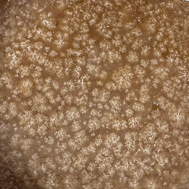上圖是由客人提供的兩個案例分享,這個白點變色現象常見於用刷子取皂的方式所致,因為濕刷子摩擦皂體以及沖洗的水分滲入了孔隙,水與皂體當中的硬脂酸作用後產生如同結晶狀的白點現象,尤其顏色較深的皂反差更為明顯,但其實除了視覺上較不美觀之外,對於皂的香氣、泡沫表現均無影響,更不是發霉的徵兆,請勿恐慌,可以繼續正常使用。